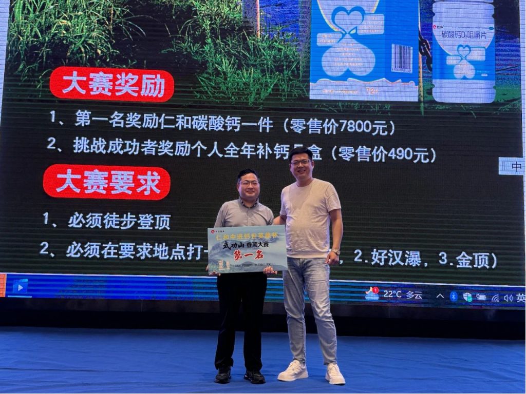 在登頂武功山環(huán)節(jié)中,增添了《鈣世英雄》登山比賽,為客戶朋友們添上了登山彩頭。參與者們需徒步上山,而每一位完成比賽的人都將獲得本人全年所需的補鈣鈣片作為獎勵。其中,表現(xiàn)最為卓越、奪得第一名的選手,更是能夠榮獲一整箱碳酸鈣D3咀嚼片的殊榮。經(jīng)過精彩激烈的角逐,來自河南省鄭州市地區(qū)的范鐵軍先生斬獲頭籌!