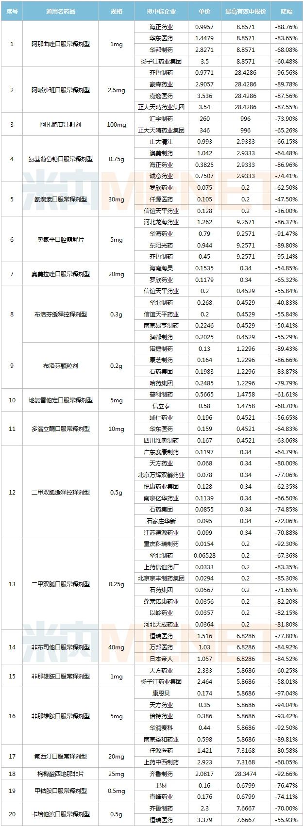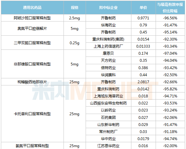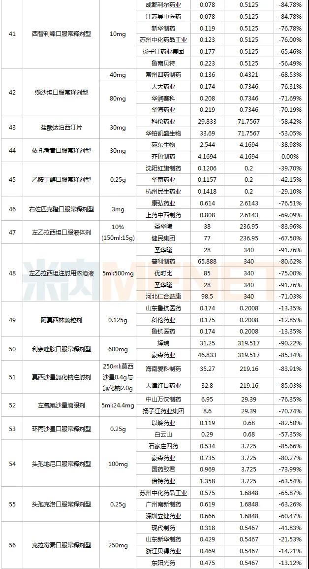 也有部分原研藥企有意參與,但無奈國產(chǎn)企業(yè)過于“瘋狂”而無奈出局,如阿扎胞苷注射劑,最高有效申報價996元/瓶,新基申報價736.5元/瓶,匯宇直接報出260元/瓶的超低價,正大天晴以346元/瓶處于第二順位;維格列汀最高有效申報價4.0893元/片,諾華申報價2.83元/片,7家國內(nèi)企業(yè)擬中選,齊魯以申報價0.45元/片處于第一順位;鹽酸達(dá)泊西汀片最高有效申報價71.7567元/片,Berlin-Chemie申報價62.667元/片,2家國內(nèi)企業(yè)擬中選,四川科倫報出29.833元/片的低價,處于第一順位等等。