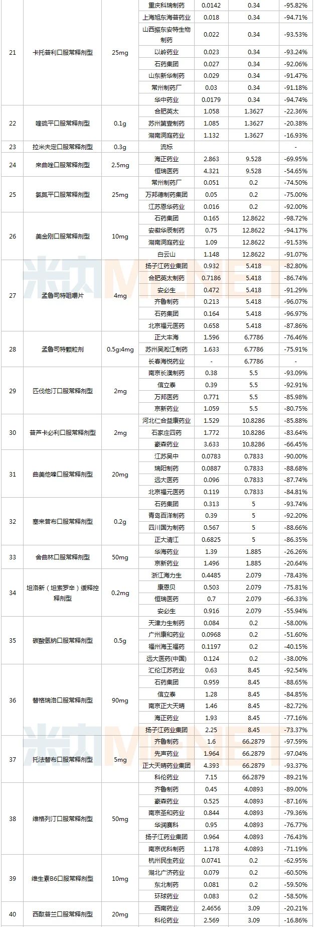 16個品種出現(xiàn)“大殺價”,降幅超過90%,其中齊魯?shù)陌⑦呱嘲唷⒖刀髫惖姆悄切郯贰⒅貞c科瑞制藥的卡托普利、石藥及齊魯?shù)拿澜饎偂R魯及先聲的托法替布降幅超過95%。